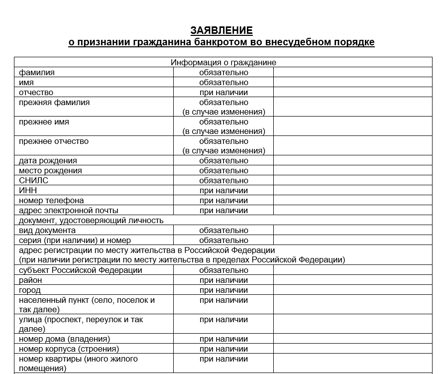 Форма заявления в МФЦ о банкротстве