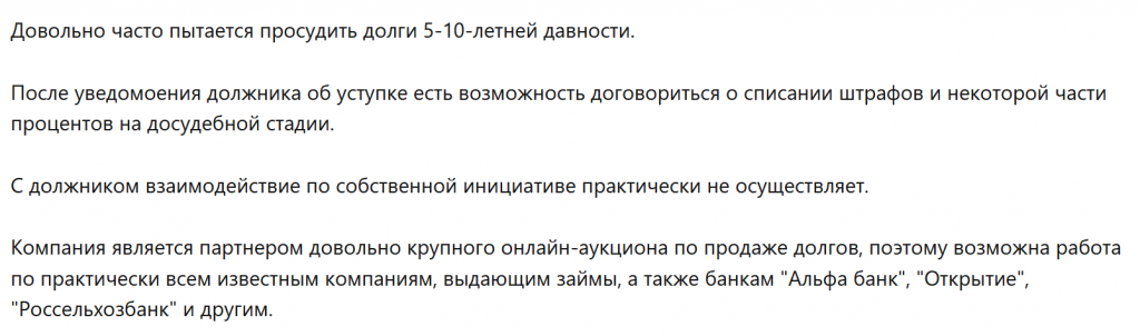 Плюс в том, что данная компания ставит целью именно помощь людям, видно, что они горят своим делом и работой, просыпается азарт, чтобы выиграть дело, а не просто капусты срубить и свалить в закат… у меня так брат попал на мошенников, которые только деньги вяали – 120 к а долги так и не списали и умыли руки. Хорошо, что мне повезло к юристом!