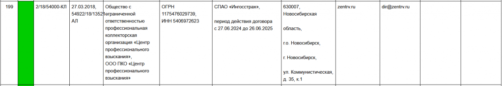 Головной офис ООО ПКО «Центр профессионального взыскания» находится в г. Новосибирске. Компания имеет регистрационный номер в реестре ФССП 2/18/54000-КЛ, что подтверждает ее право на ведение коллекторской деятельности. Агентство имеет низкую категорию риска по данным ФССП. Это значит, что в работе компании не выявлено нарушений законодательства.