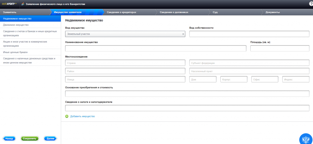 Честно внесите всё своё имущество: недвижимость, автомобиль, дачу, гараж. Если вы владеете объектом совместно (например, доля в квартире), обязательно отметьте это. Полная информация поможет финансовому управляющему объективно оценить ваше финансовое положение, а вам — исключить проблемы и риски в процедуре.